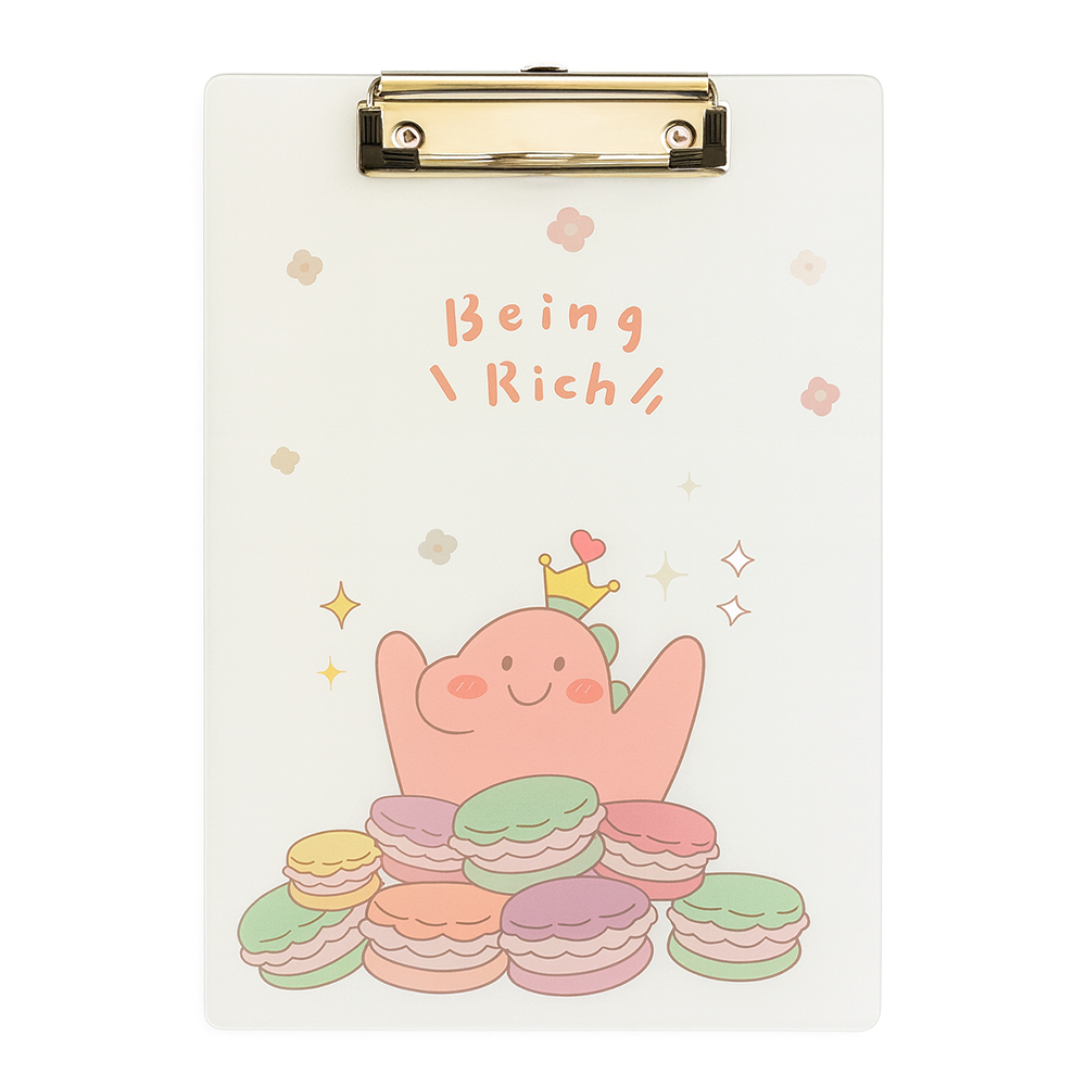 Tabla Porta Papeles formato A4, transparente con diseño de Dinosaurios y pastelitos.