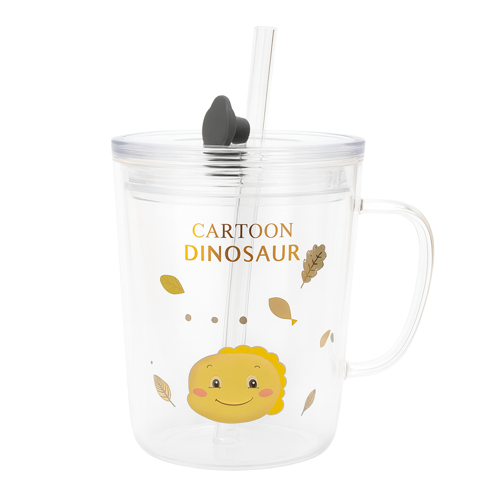 Hermoso tazón de vidrio de dinosaurio con bombilla y tapa.